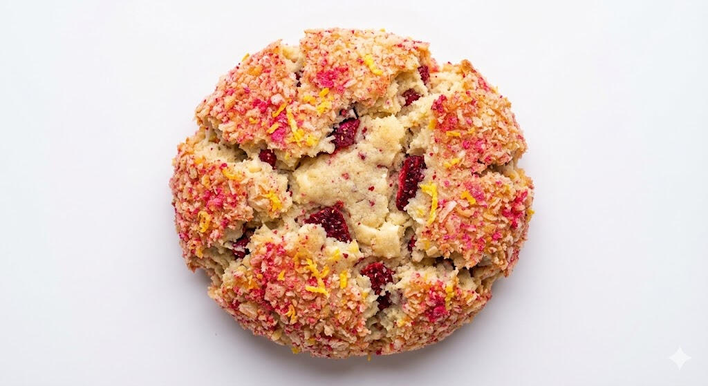 A Lemon-zested panko crust around a strawberry-studded core โ three textures in conversation, designed to make you reach for another.This creation challenges what a cookie can be. We take the familiar strawberry shortcake ice cream bar and deconstruct it into layered architecture: citrus-armored panko, white chocolate tenderness, and freeze-dried strawberry intensity.This is nostalgia pushed forwardโchildhood memory refined through technique, texture sequencing, and acid-balance engineering.Art you can eat.